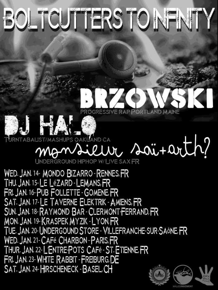 Quick note on my phone from the road on the Boltcutters To Beyond tour w/Browski & Monsieur Sai + Arth? to let you know I'm on tour in Europe till 1/27; figure that's a cool thing to let you know about, right? BOLTCUTTERS TO INFINITY TOUR Jan. 14- Rennes https://www.facebook.com/events/807324252661573/ Jan. 15-LeMans https://www.facebook.com/events/375112529314883/ Fri. 1/16- … Continue reading Euro Tour!